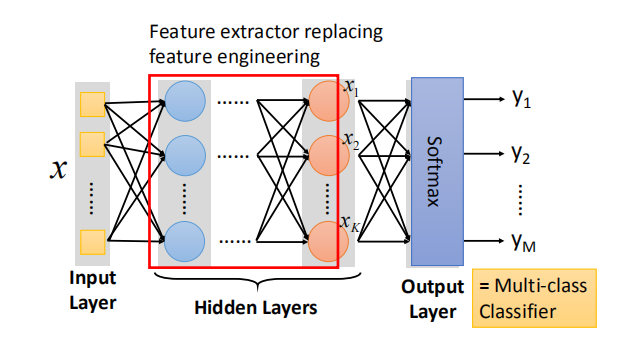 • 全连接前馈网络的隐藏层起到特征提取的作用,输入的特征经过隐藏层之后转换成一组新的特征,取代之前的手动特征转换工程。