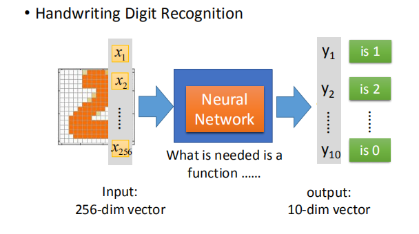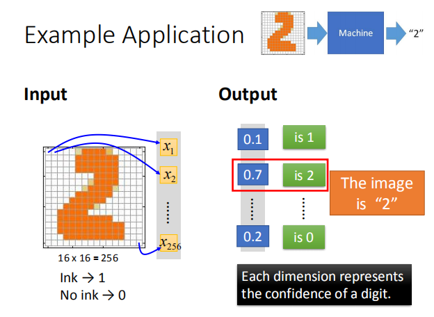 • 假设输入图片的解析度为 16 * 16,那么它就有 256 个像素,对应一个 256 维的向量;