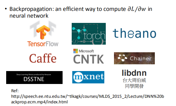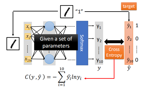 • 整个网络的损失函数:$L=\sum_{n=1}^N C^n$ ,即所有训练数据的交叉熵的和