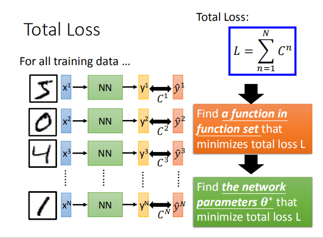 • 接下来,我们需要在函数集中确定一个函数使总损失达到最小,即确定神经网络的参数 $θ^*$ 使损失函数最小