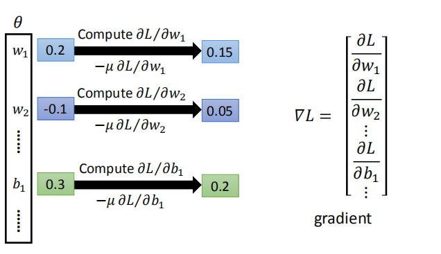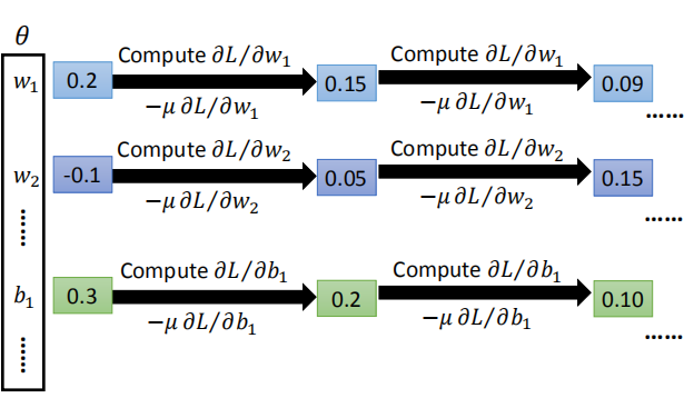 • 给定一组参数的初始值,计算梯度,根据学习率更新参数值,循环往复,直到找到一组好的参数。这就是机器在深度学习中的学习过程。
