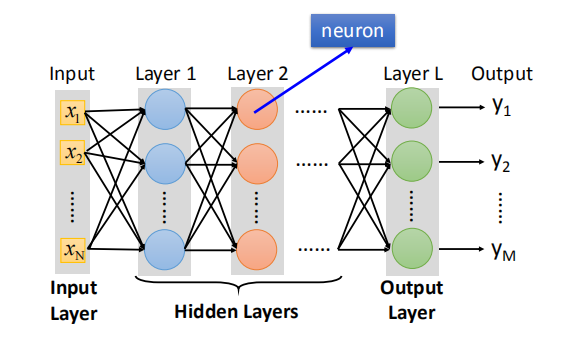 • 一般而言,每一层神经元的个数和层数都是不确定的。隐藏层的层数对应 Deep 的概念。