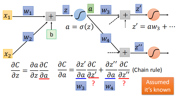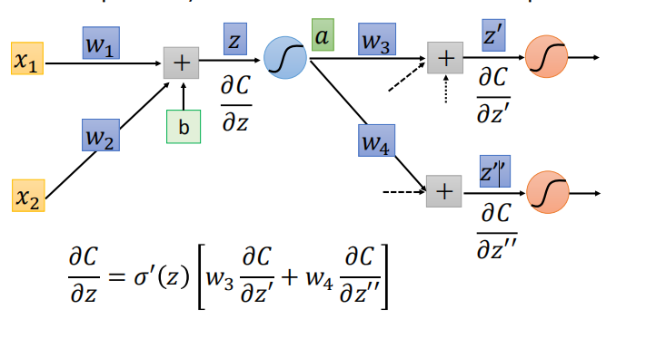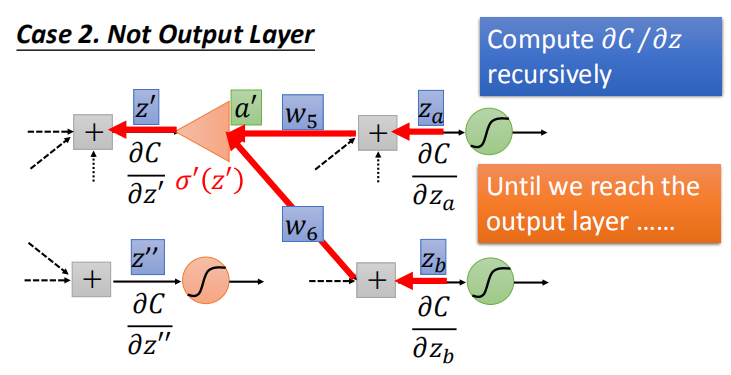 • 情况2:该层不是输出层,我们可以递归地计算,直到我们到达输出层。然后,从输出层不断向前计算,得到 $\frac{\partial C}{\partial z}$
