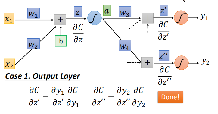 • 情况1:该层是输出层,$\frac{\partial C}{\partial z’}$ 和 $\frac{\partial C}{\partial z’’}$为输出层的输入