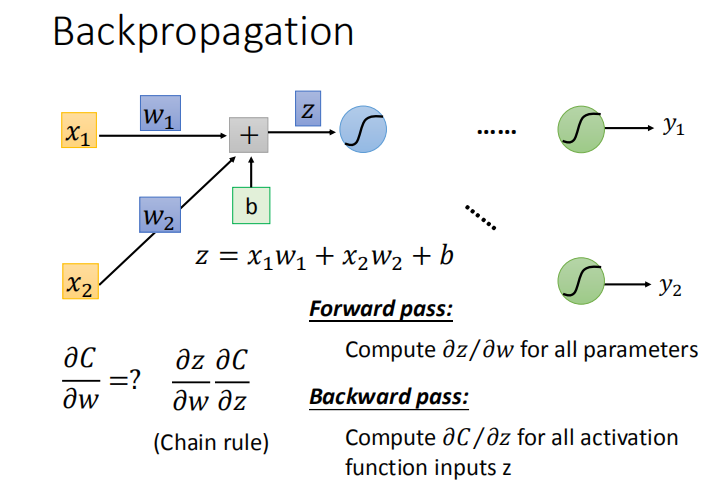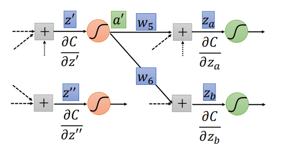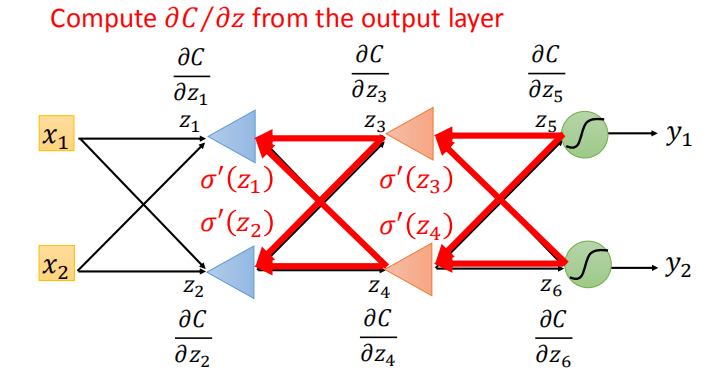 • 反向传播阶段:计算所有参数的 $\frac{\partial C}{\partial z}$