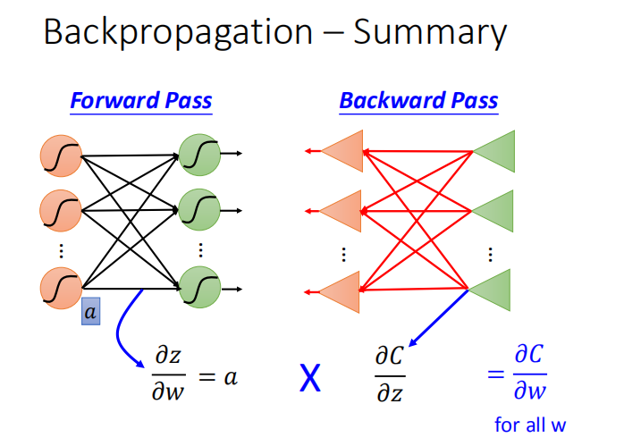 再从反向传播中求出$\frac{\partial C}{\partial z}$,将上述结果相乘即得到$\frac{\partial C}{\partial w}$