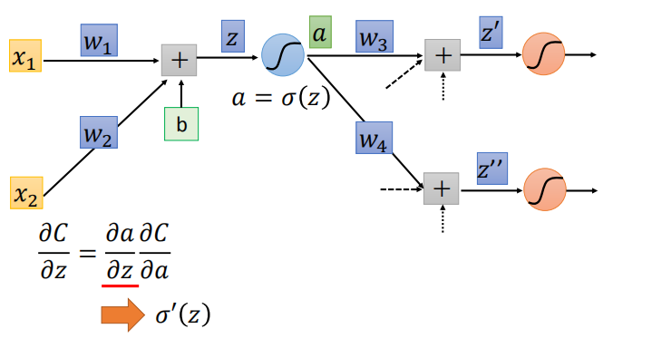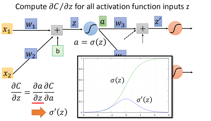 • 计算 $\frac{\partial C}{\partial z} : \frac{\partial C}{\partial z} = \frac{\partial a}{\partial z} \frac{\partial C}{\partial a}$