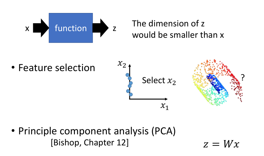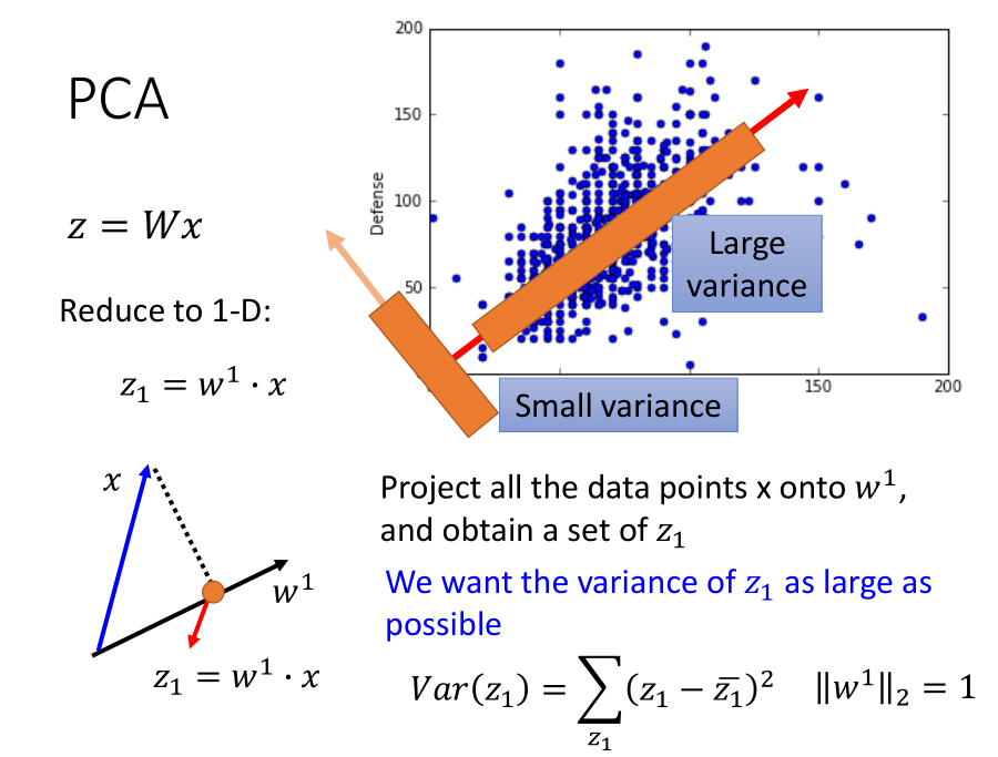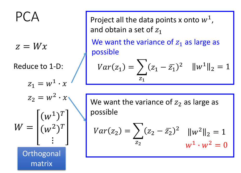 假设z是一维数据,假定 $||w^1||_2 = 1$,此时 $w^1x$ 表示 x 在 $w^1$ 上的投影;