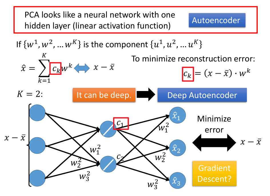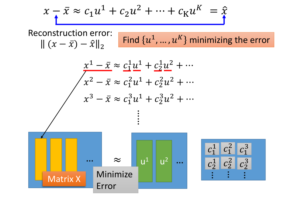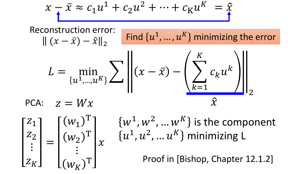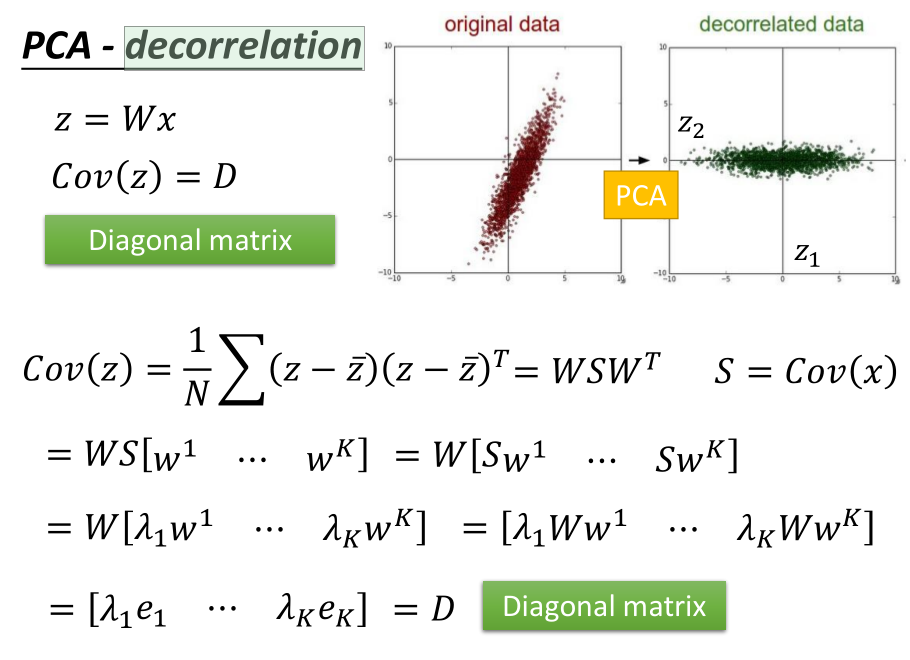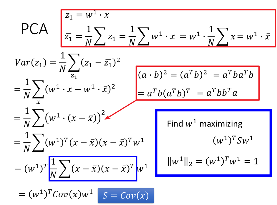 现在考虑高维情况,此时同样的思路也是找到相互垂直的 $w^1,w^2…w^K$ ,使得 $z^1,z^2…z^K$ 分布方差最大。