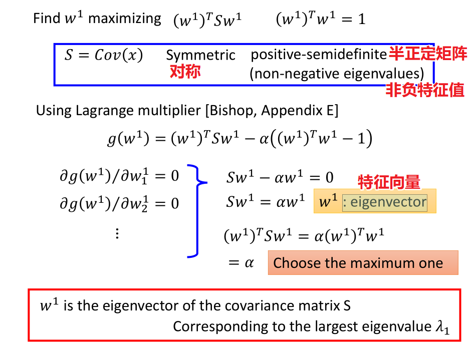 $w^1$是协方差矩阵S的特征向量;并且与其相对应的最大特征值$\lambda_1$