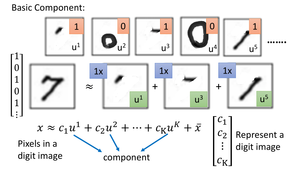 直觉上可以理解向量中与数字有关的向量维数较少(背景的像素点均为无效向量),所以我们可以用少于28X28维的向量来描述它。