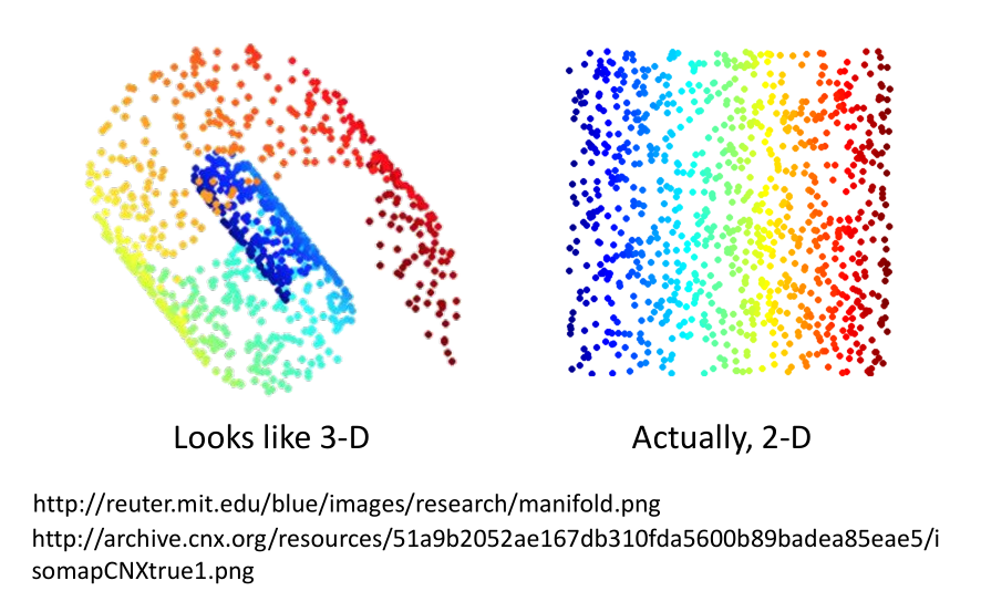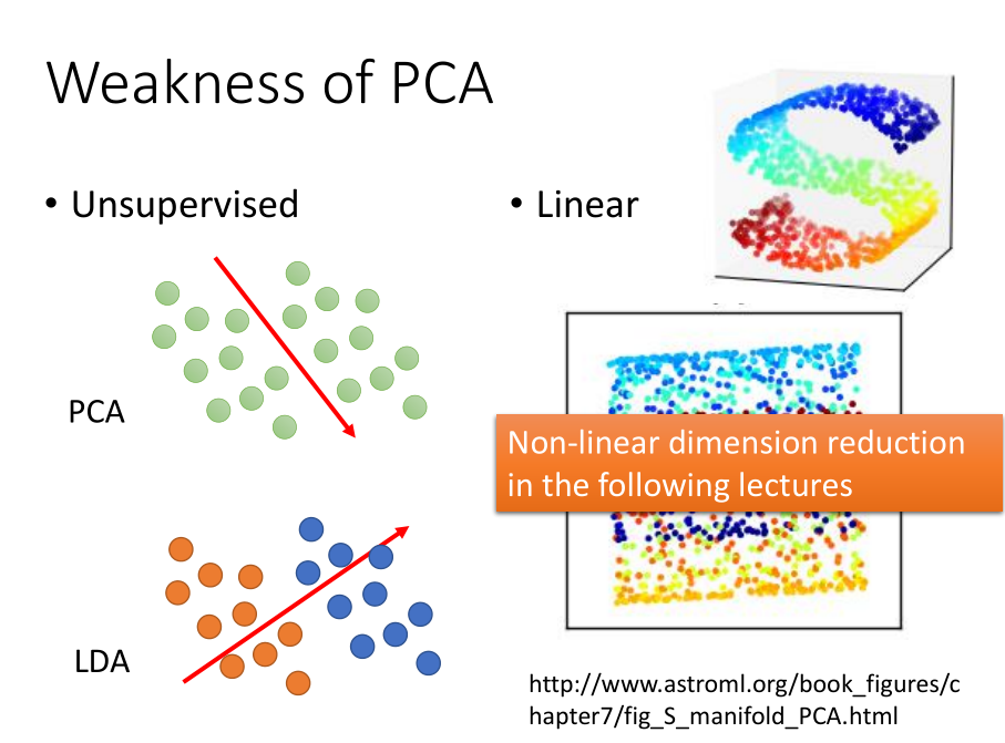 • PCA 是线性的。把一个三维空间中的S形分布的数据做 PCA 之后的效果,就是把 S 形拍扁,而非展开。
