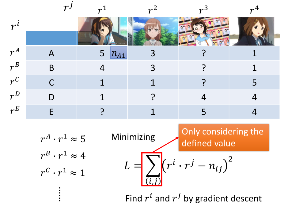 先定义 loss function L(只考虑有定义的数据),用 gradient descent 实现。
