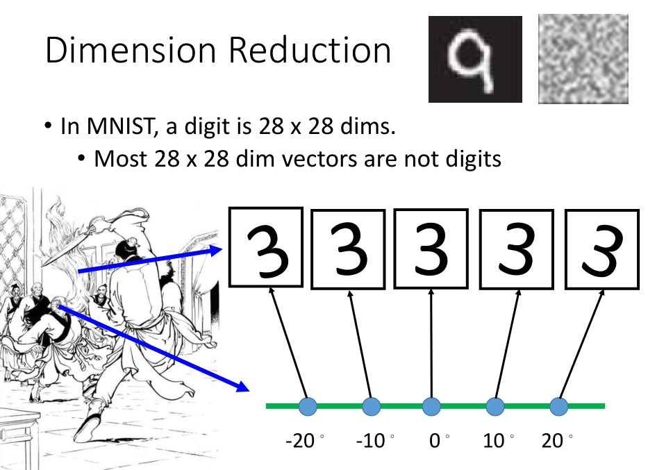比如上图一堆3,每一个都是28X28维的向量,但是我们发现,它们仅仅是角度的不同,