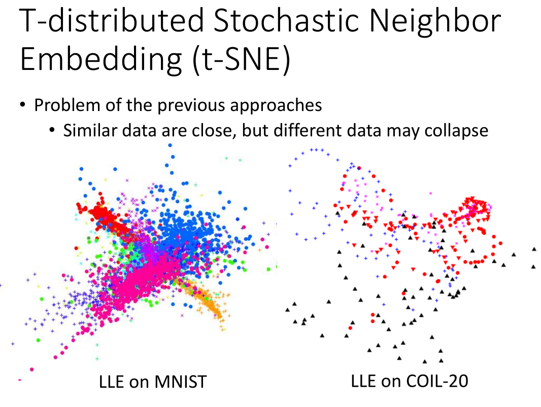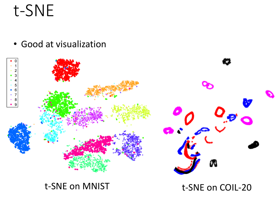 如果之后再给一个数据,t-SNE 是没法做的,只能再跑一遍。