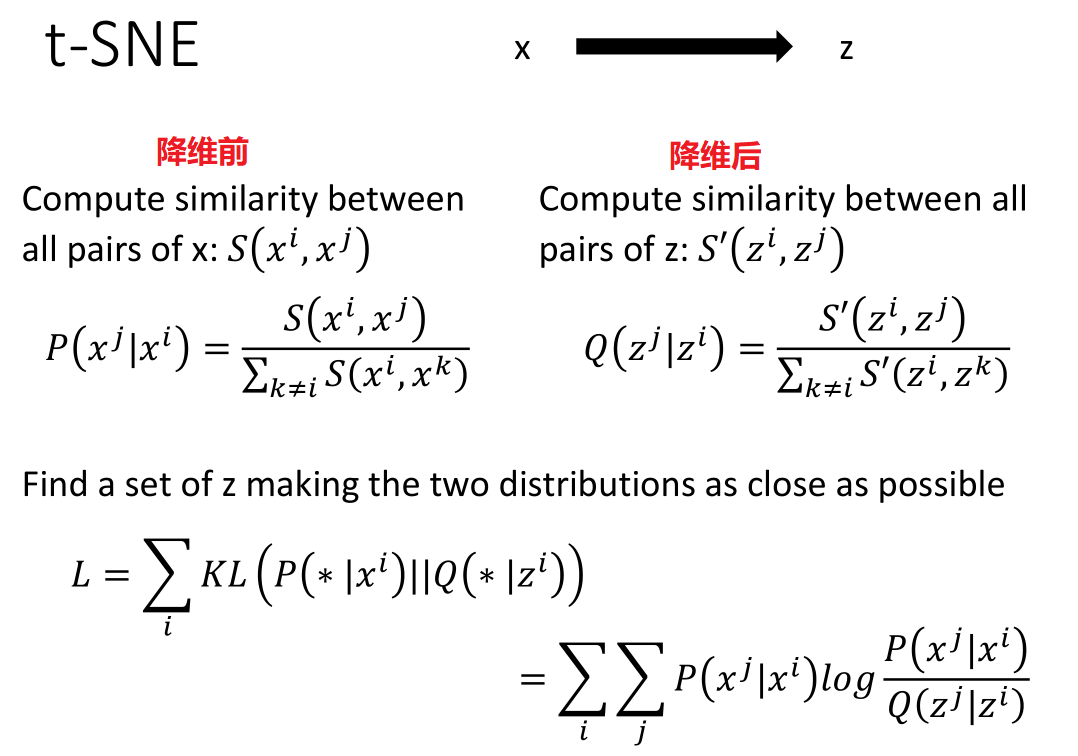 t-SNE 先分别计算原空间、新空间中所有点对的相似度再归一化。