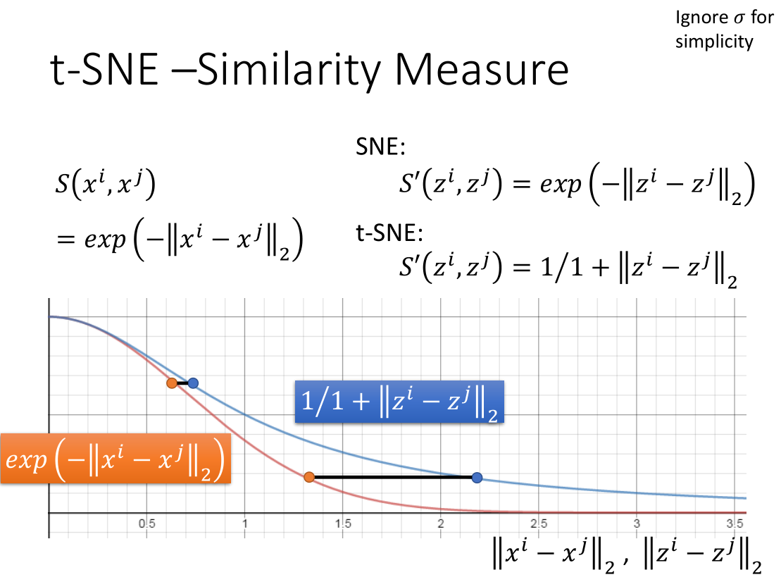 t-SNE 的神妙之处在于原空间与新空间中相似度计算公式不同。