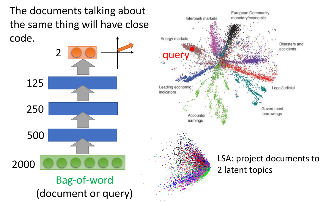 词袋经过 auto-encoder 之后得到 code 。上图中不同颜色代表文档的不同种类。