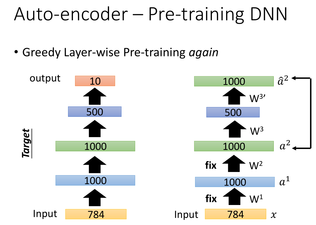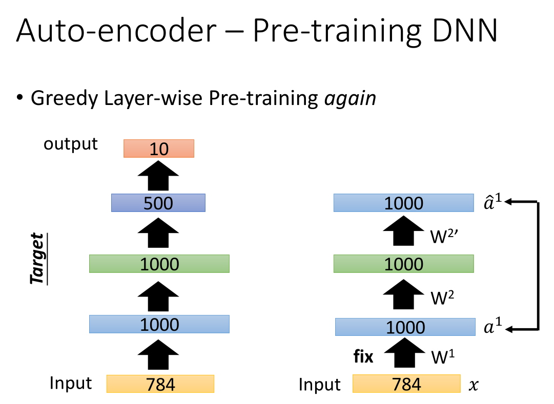Auto-encoder 还可以Pre-train DNN,第一步先将784维的数据转换成1000维,再将1000维的数据解码转换成784维,这样就可以通过比较先后784维度的数据更新得到w1。
