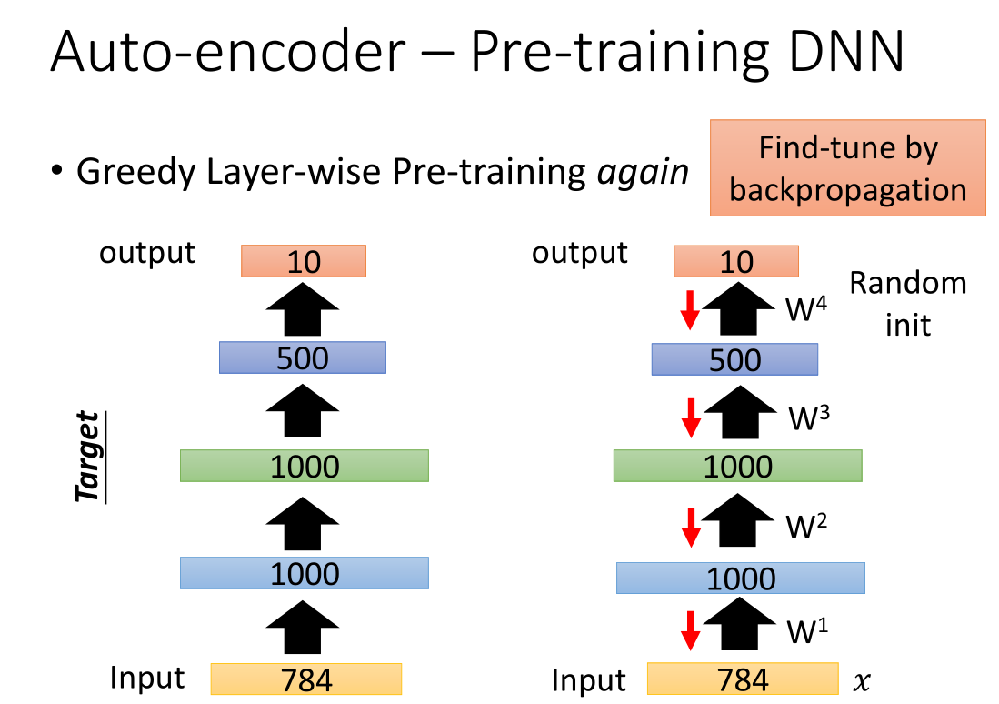 以此类推,最后随机初始化输出层之前的权重。然后用反向传播做 fine-tune (W1,W2,W3已经很好,微调即可)。