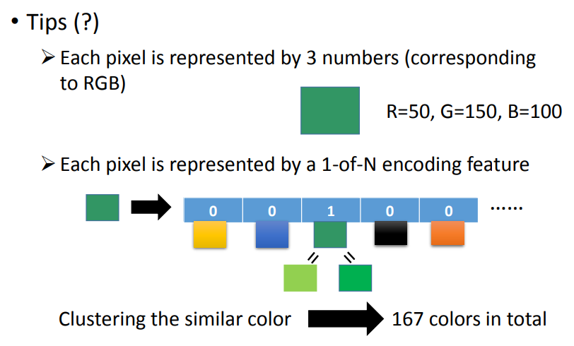 可以把众多颜色聚成若干类然后做 1-of-N encoding 。
