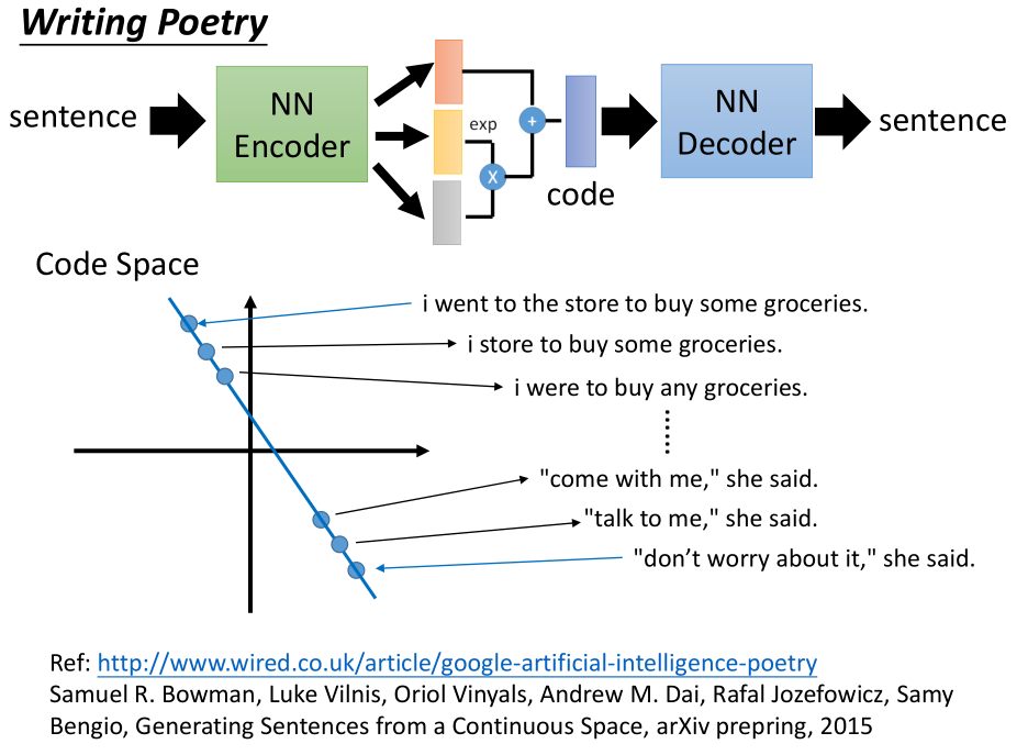 在 code space 上是两个点,连接两点、等距采样、用 decoder 还原,得到一系列句子。