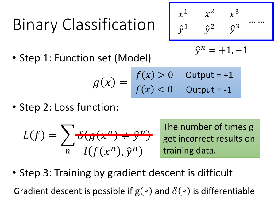理想的损失函数 $\delta (g(x^n) \ne \hat y^n)$在优化过程中出现不可微分的情况,