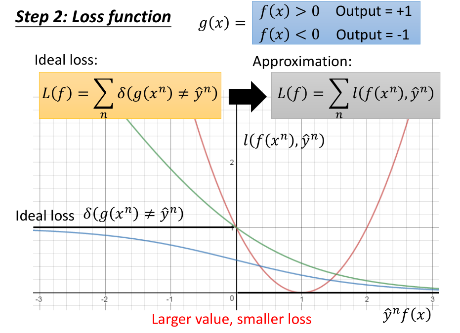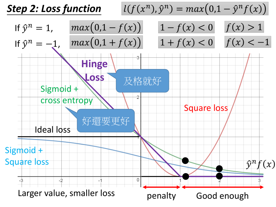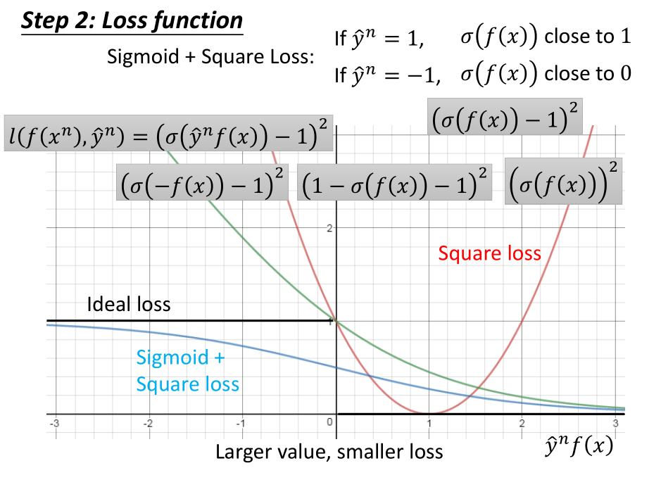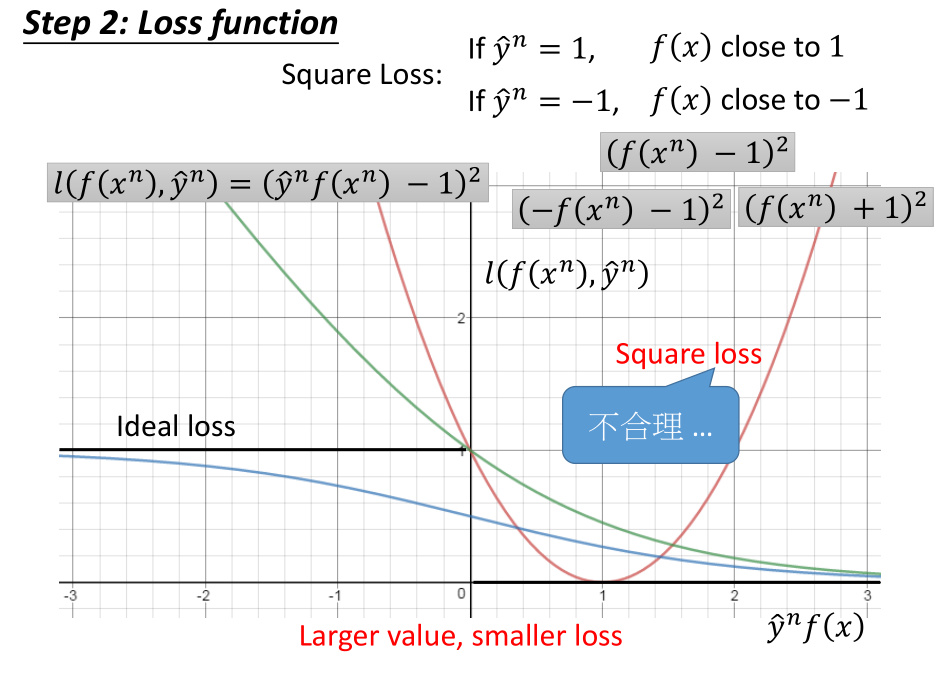 当 $\hat y^n=+1$ 时,我们希望 $f(x)$ 的值越接近 +1 越好;当 $\hat y^n=-1$ 时,我们希望 $f(x)$的值越接近 -1 越好。