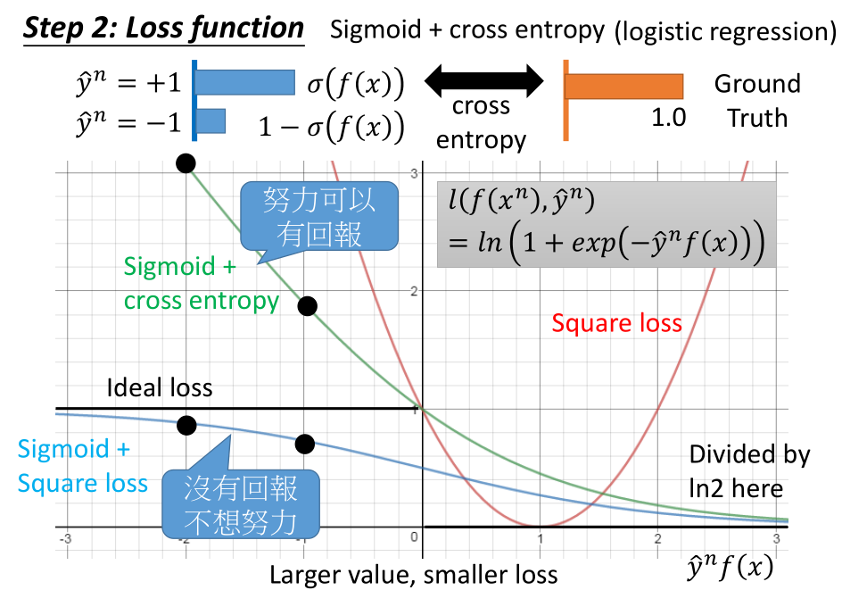 利用 $ sigmoid + cross entropy$ 计算得到的损失函数表达式为$l(f(x^n),\hat y^n)=ln(1+exp(-\hat y^n f(x))$