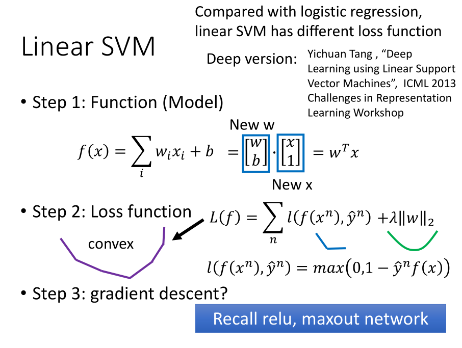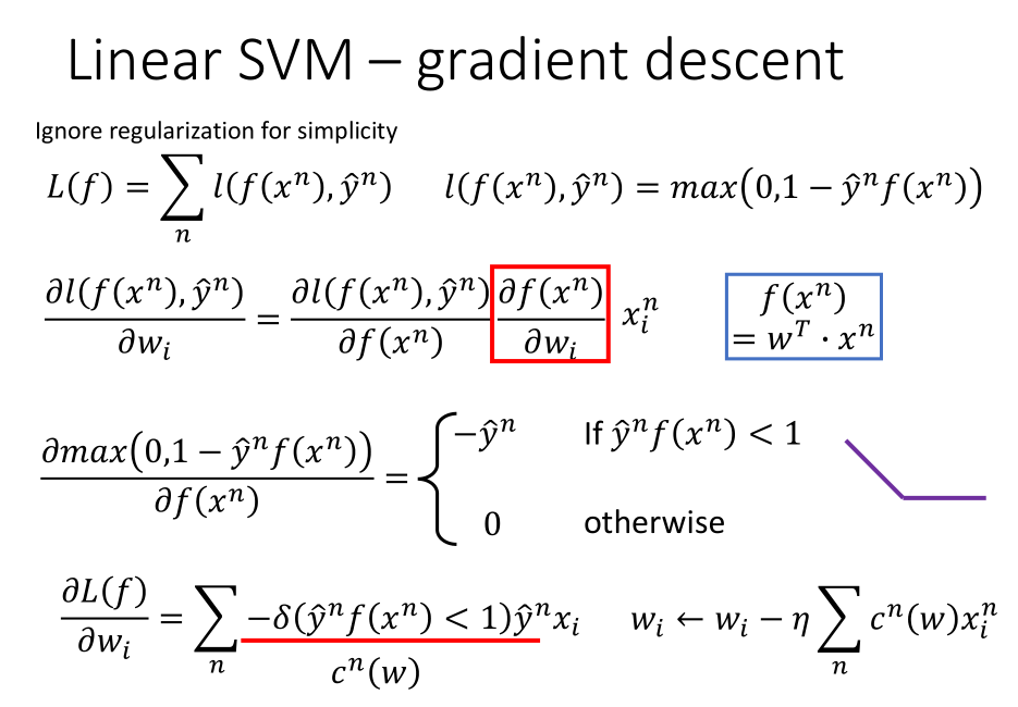 - 步骤三:由于损失函数中的铰链损失函数和正则化的部分都是凸函数,所以损失函数也是凸函数,可以通过梯度下降找到最优解。