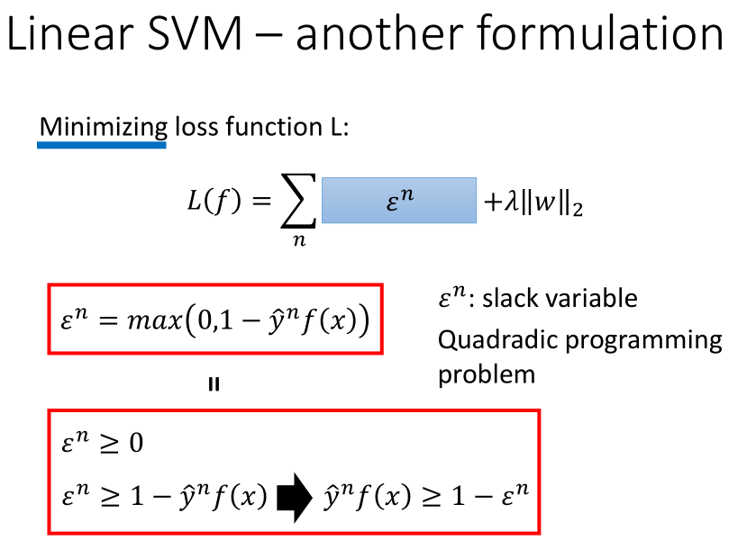 下面红色方框里的式子就是我们常见的 SVM 的约束形式,$ε^n$ 称为松弛因子。