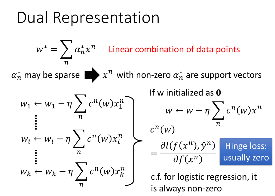 由于损失函数采用的是 Hinge Loss,很多的 $c^n(w)$ 可能为 0,从而 $α_n^∗$ 是稀疏的的,而那些具有非零 $α_n^∗$ 的数据点 $x^n$ 称为支持向量。