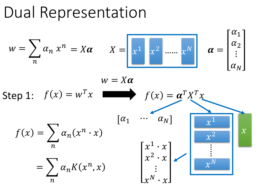 根据 $w=X \alpha$, $f(x)$ 可以写成 $f(x)=Σ_n$ $\alpha_n (x^n⋅x)$ 的形式,