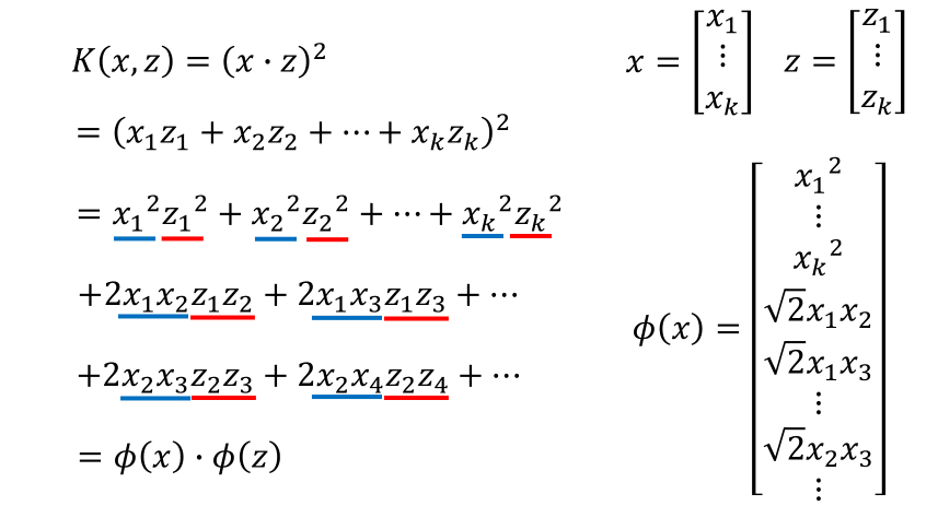 而我们可以使用核函数来达到相同的效果,而且使用核函数来进行计算会比先进行特征变换再计算内积更快。