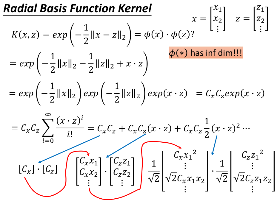 将核函数展开为泰勒级数的形式,可以看出该函数等价于最高维度为无穷多维向量的向量内积的多项式形式。