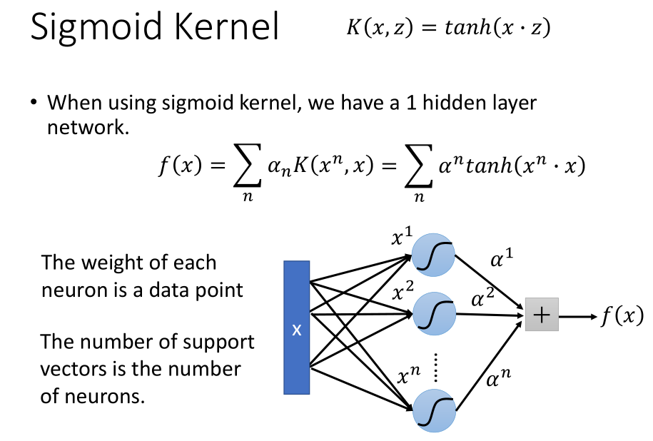 当我们使用 Sigmoid 核函数的时候,我们可以将支持向量机的模型看做只有一个隐藏层的神经网络。